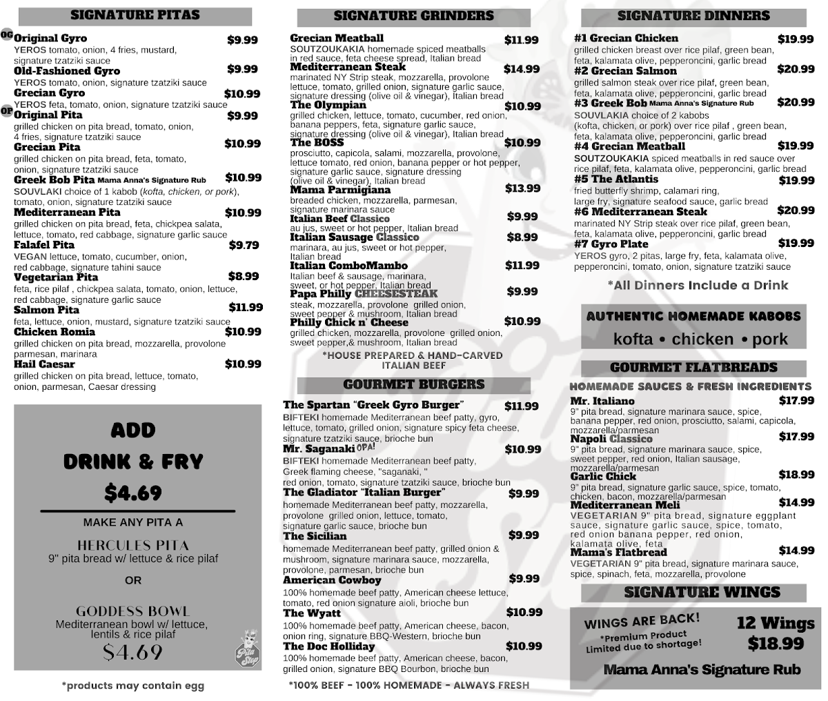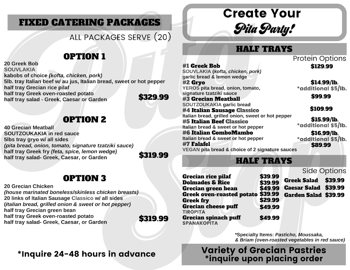 The Pita Pack section is perfect for those seeking a filling and flavorful meal, with options like the Mediterranean Platter and Italian Sausage Classico, each offering unique, savory flavors. For those who love Greek cuisine, the Greek Bob and Athenian Platter stand out, along with the classic Italian Beef Classico.