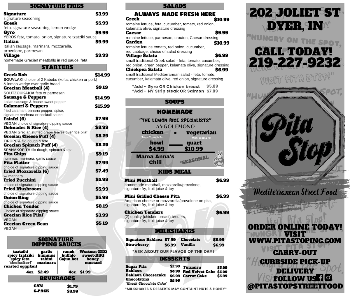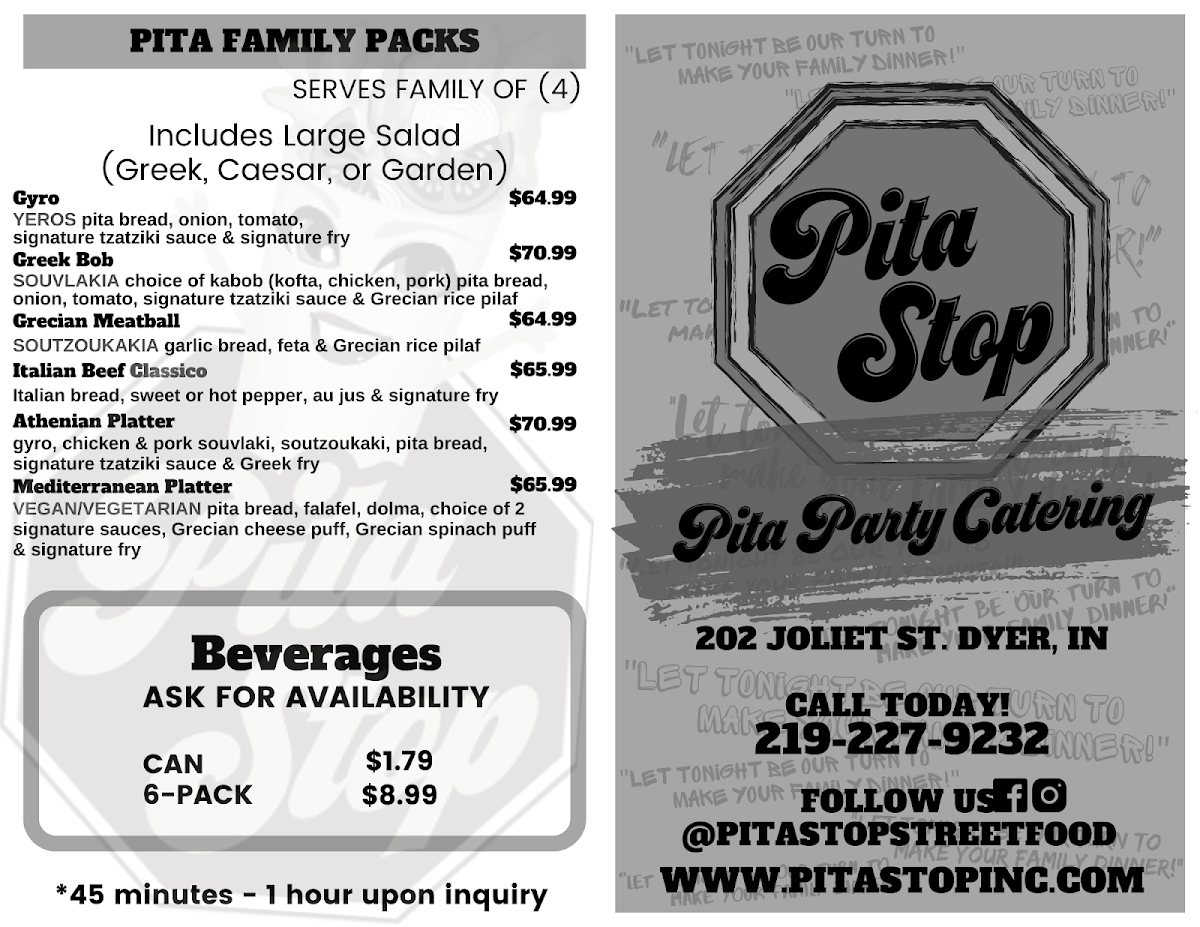 The menu at Pita Stop, located at 202 Joliet St, Dyer, IN 46311, offers a diverse array of Mediterranean-inspired dishes that cater to various tastes. Whether you're craving a hearty platter, a fresh salad, or a flavorful pita, this restaurant has something for everyone.